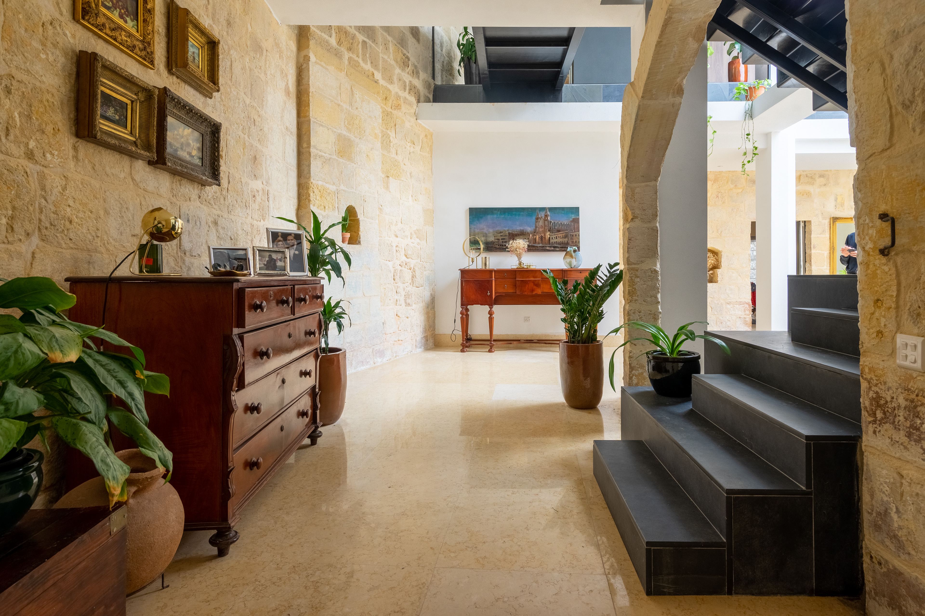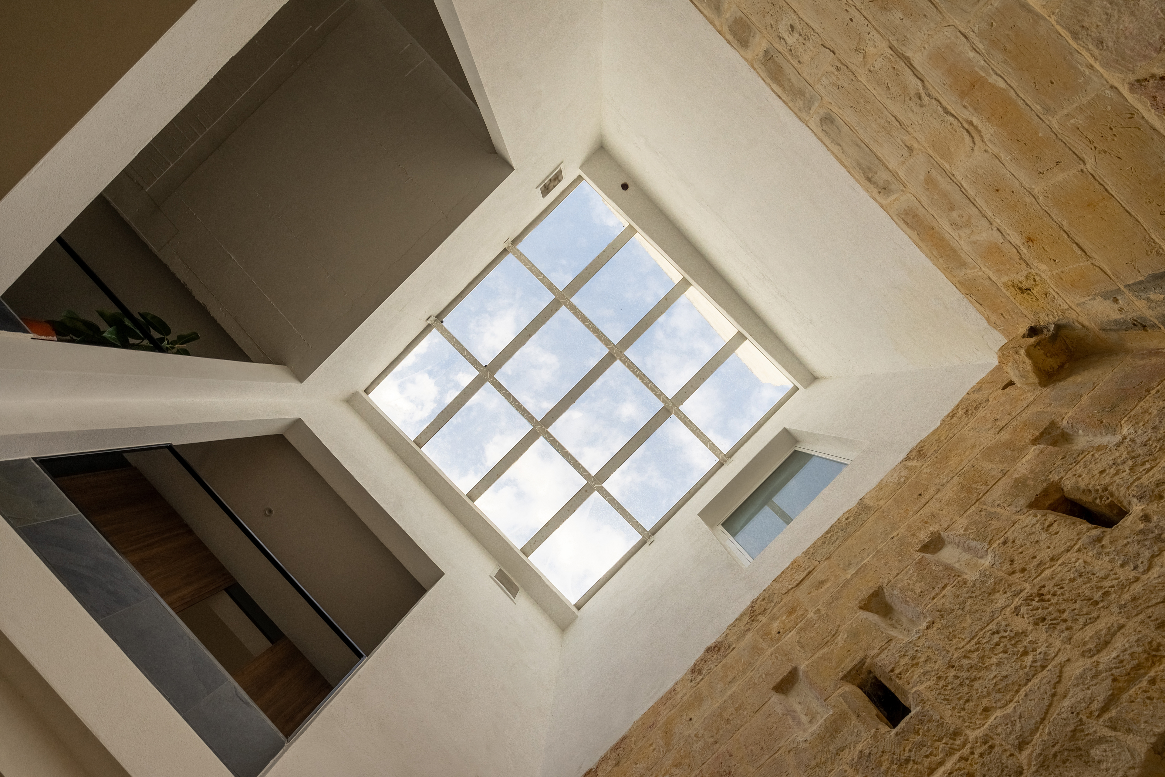 Renovating a heritage home can be a challenging process to navigate through, but once the historic and cultural significance of the building is identified one can easily establish with the authorities what is worthy of preserving and therefore work within a framework. It was imperative to maintain as many historic features as possible. This could be appreciated in features such as the old supporting ‘hnejja’, reminiscent of the past which has been kept, freestanding feature as the entrance to the open new mixed material staircase. We got also creative with other features such as the old wooden apertures which have been renovated and reused as table tops and mirror frames.