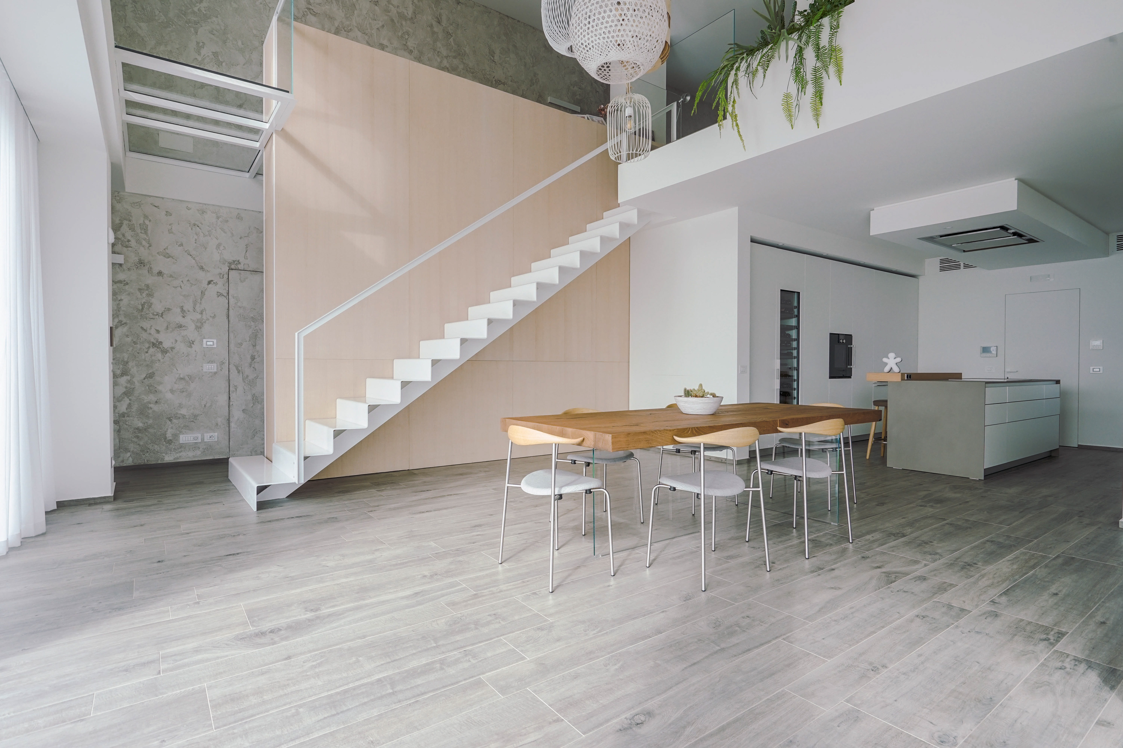 Villa F - The light colour palette used for the interiors creates this peaceful, homey ambience. The white sprayed metal staircase and the oak wood storage system are an architectural statement piece in the house. The rest is a mix of light grey and pastel colours which was used for the furniture and floor. The wood accent in the dining table and chairs, bohemian lighting and touch of green helps to contrast the minimal interior and add more character to the villa. The interiors colour palette perfectly blends with the exterior of the house. The result is a playful, modern and minimal interior which is comfortable and easy to live in.