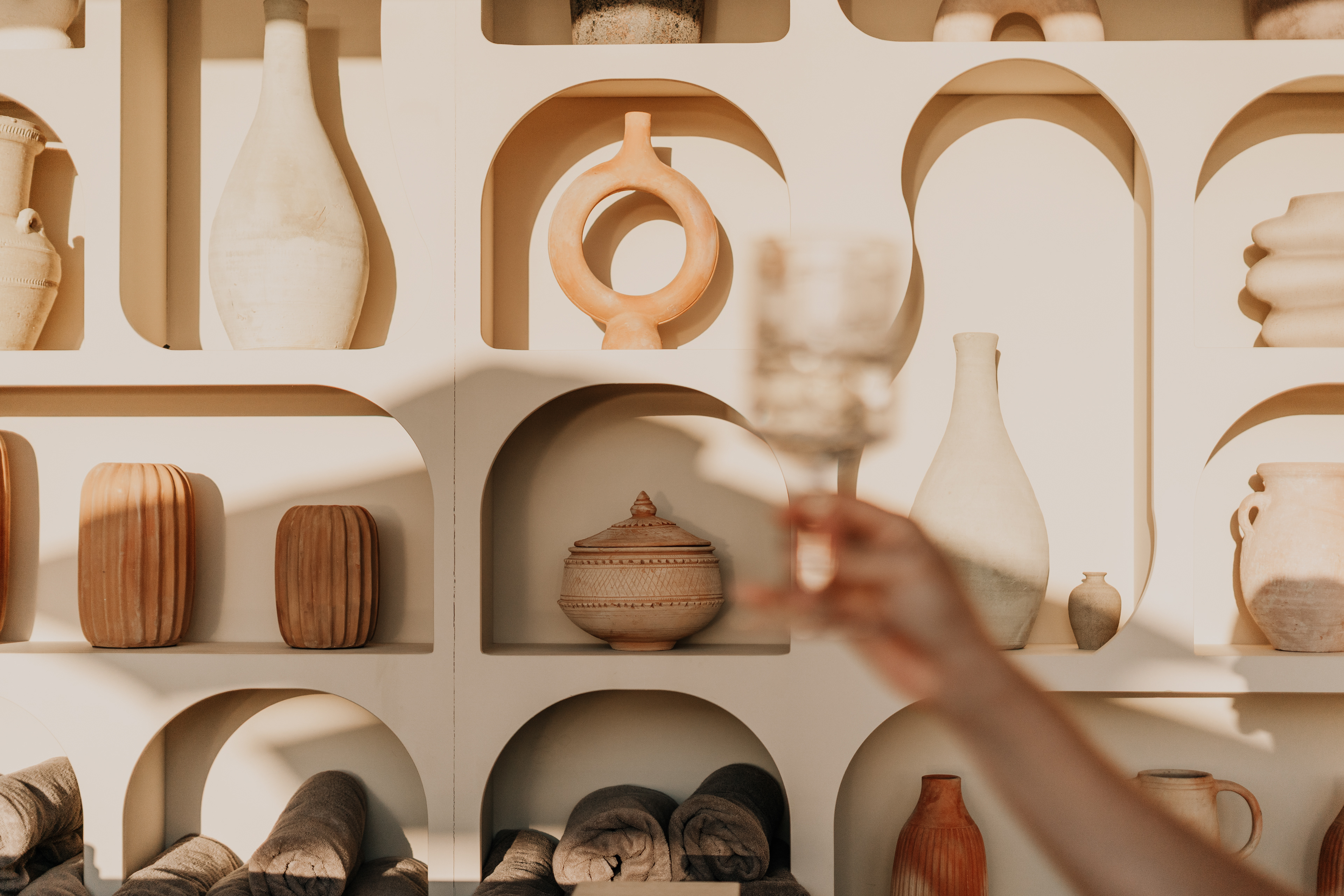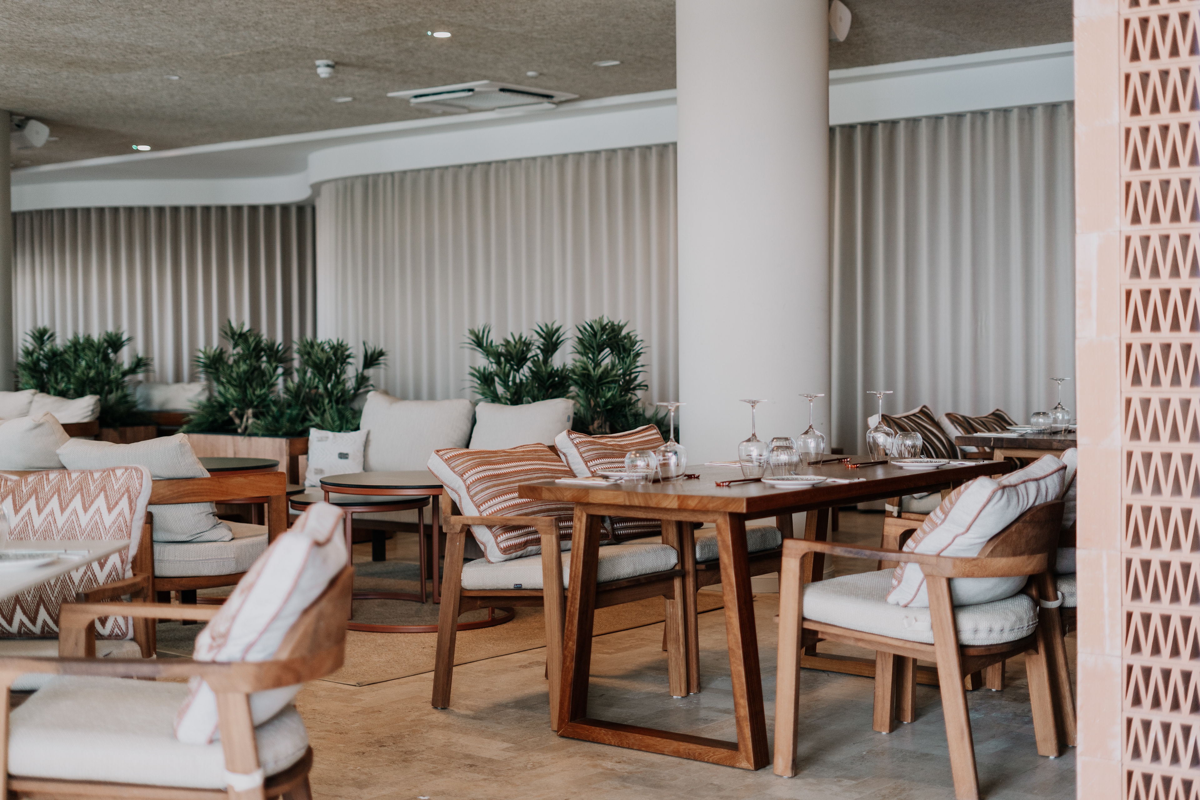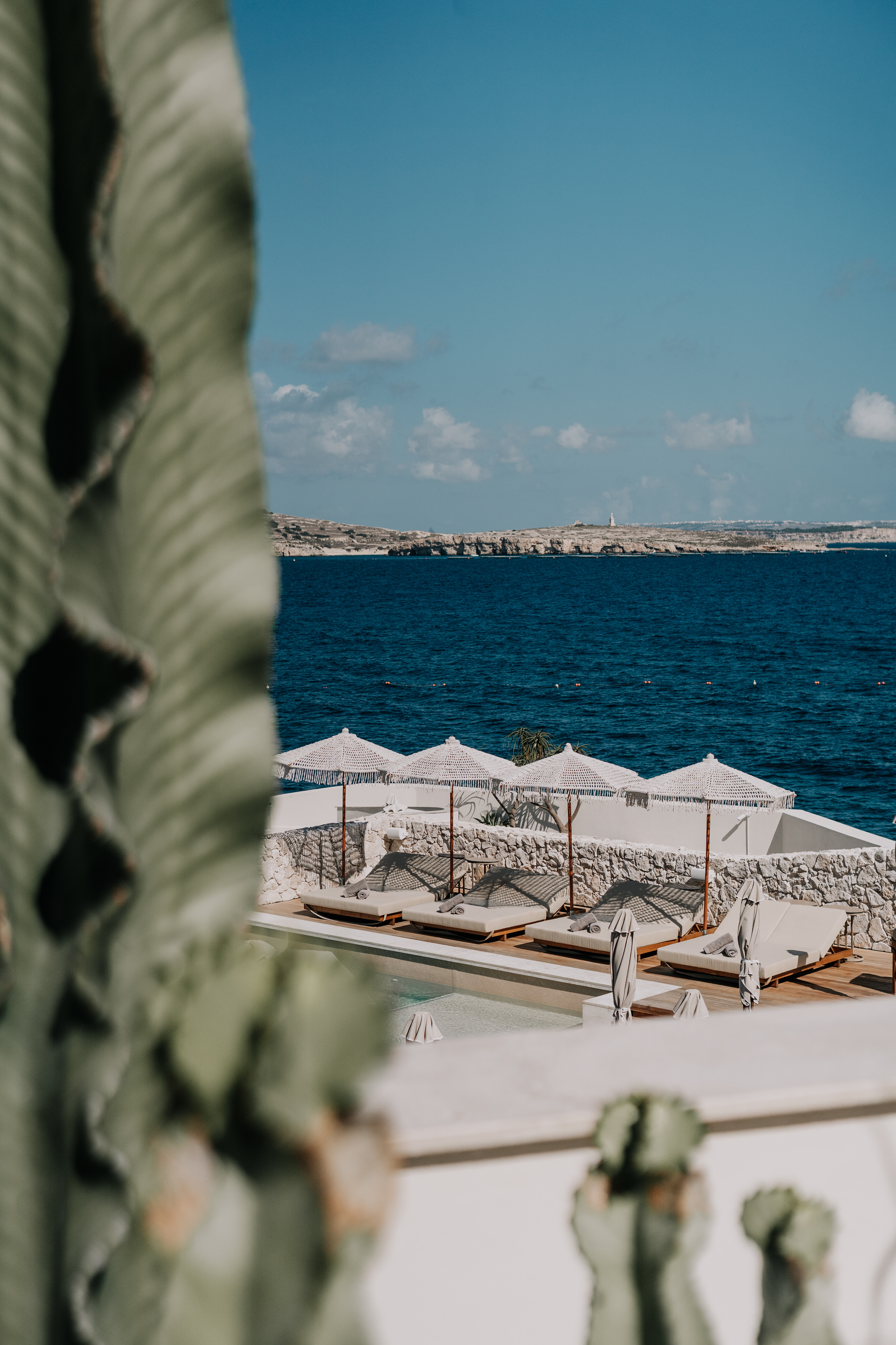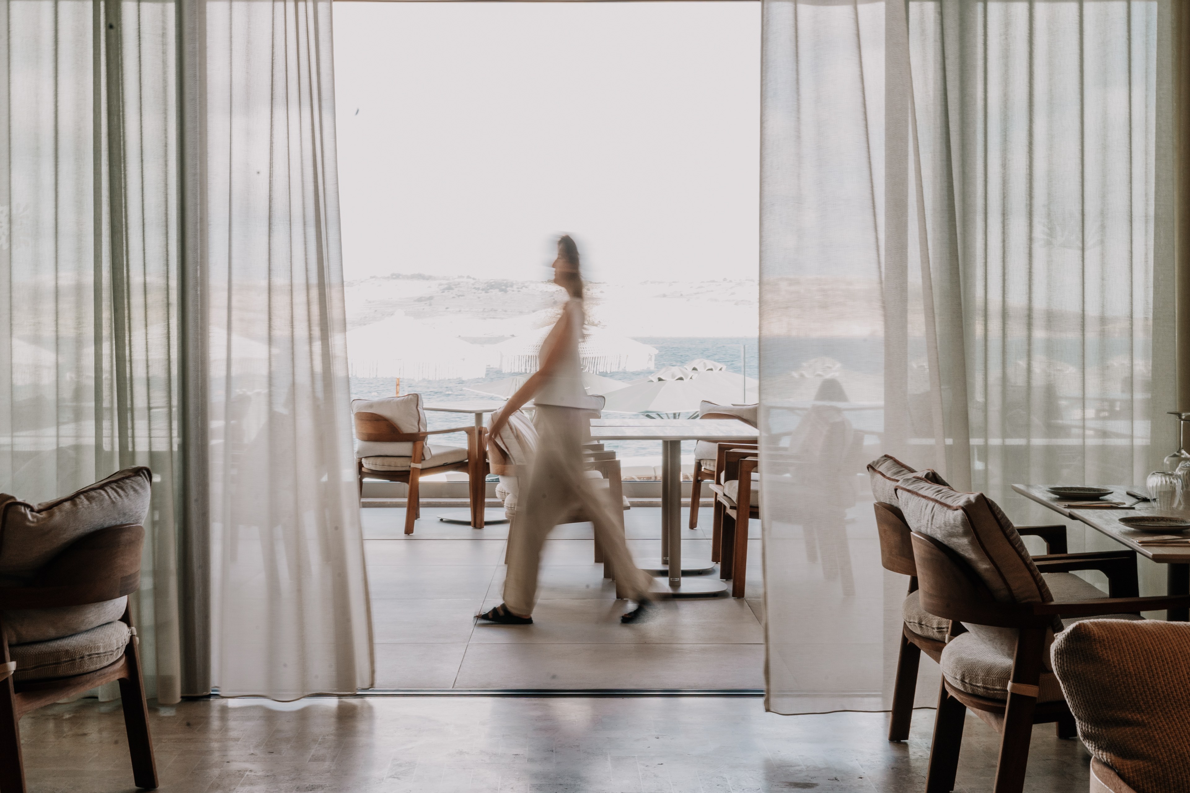 The terrace hovers above the shoreline — stone beneath bare feet, sky folding into the sea. Glasses catch the light; shadows slip between sculptural chairs. A hand lingers on the curve of a cocktail glass, music hums low, and conversations feel wrapped in silk.