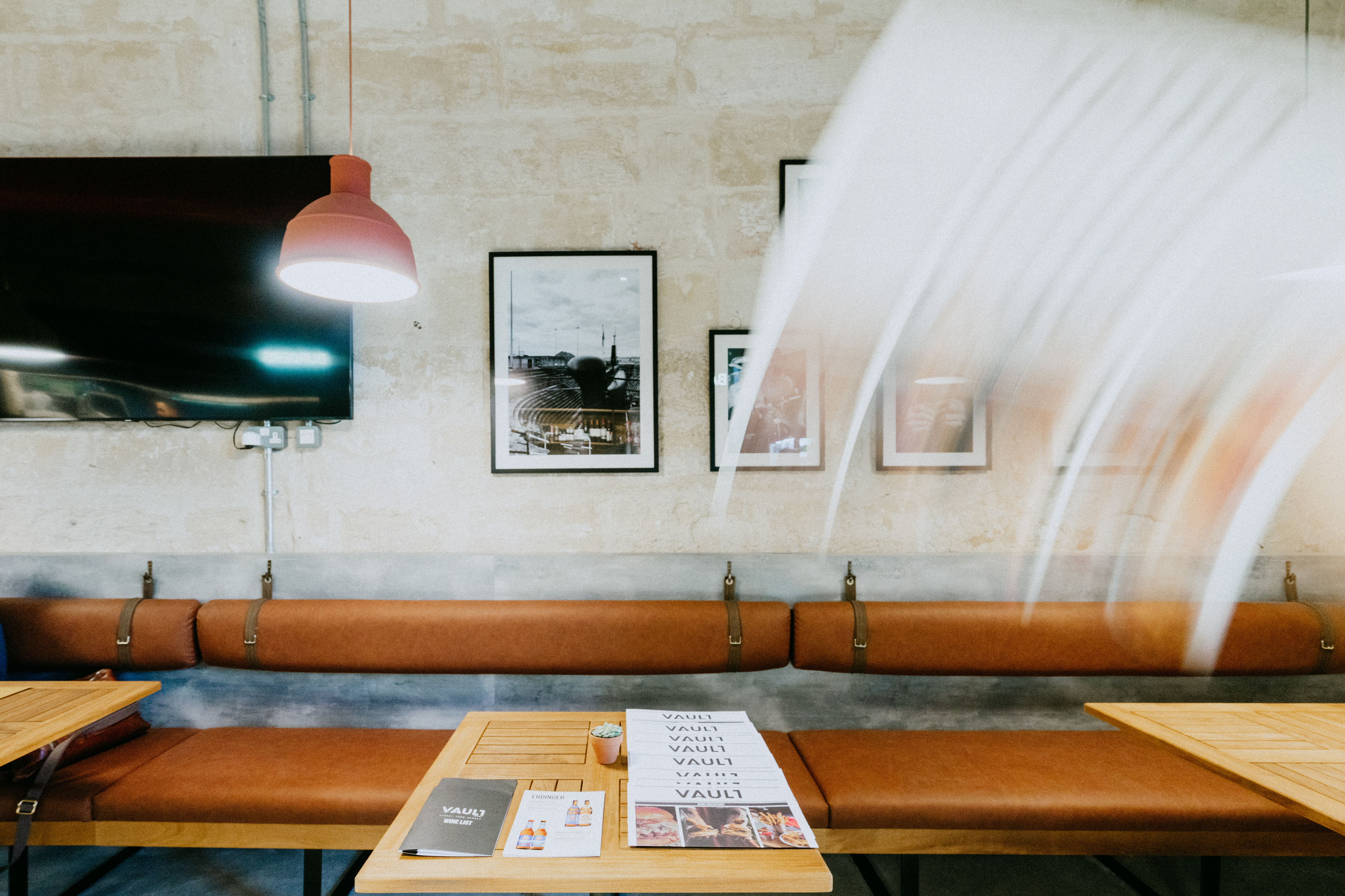 The design of the establishment was inspired from the original use of the vault which operated as a magazine for the Knights of St. John and the British Royal Army. A 40 feet shipping container took centre stage in the vault and serves as an open kitchen that serves various kinds of food, from pizza to salads. An industrial design look was kept throughout the space by using materials such as metals, raw wood, concrete, leathers and an exposed ceiling to show off the beautiful vaulted ceiling which originated in the 16th century. The colourful a/c duct and kitchen tiles combined with the big hand painted mural adds a nice pop and contrasts the otherwise minimal industrial design of this compact and versatile eatery.